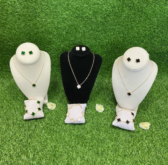 Upgrade Your Style With This Clover Luxe 3-Piece Set. This Exquisite Set Captures A Sense Of Timeless Luck And Natural Elegance. Features Include A Pair Of Stud Earrings ,Single Pendant Necklace And A Motif Bracelet With Deep Colored Inlays , Framed By Delicate Beaded 24K Gold Plating That Borders And A Vintage Yet Sophisticated Texture.